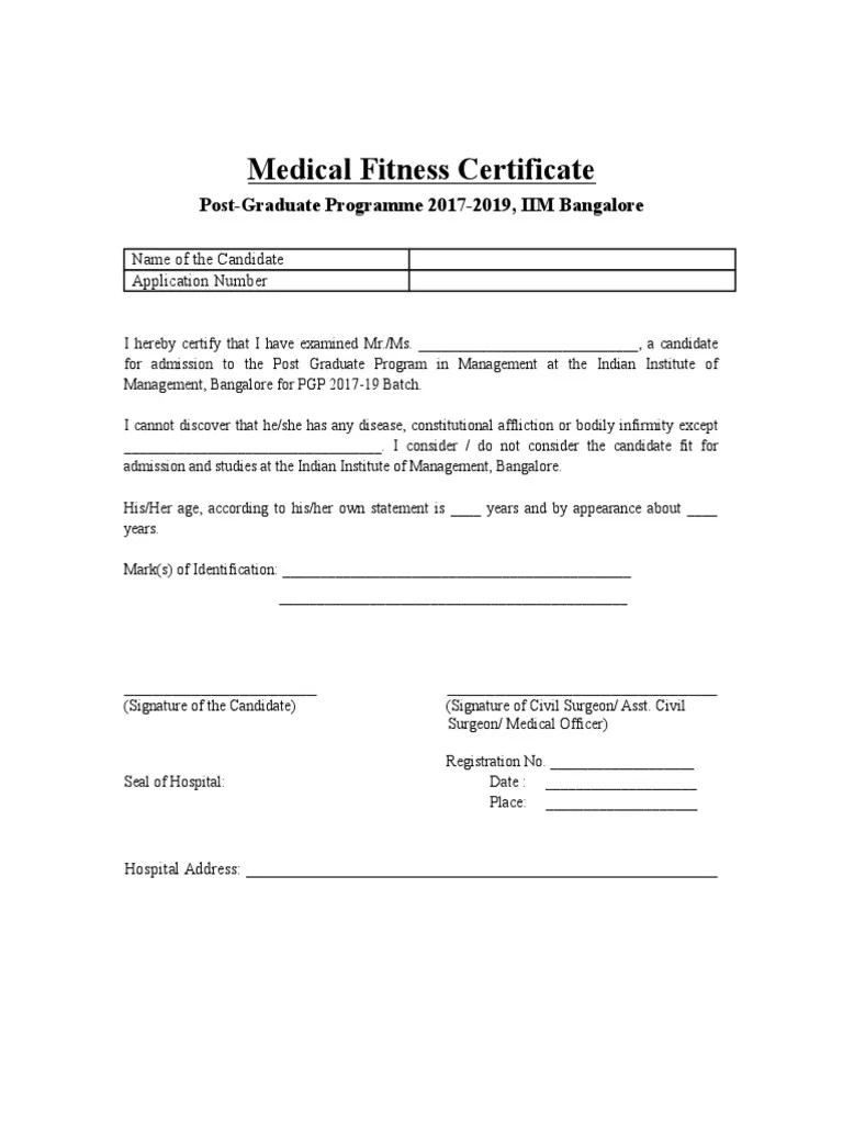 Physical fitness certificate for admission to engineering / medical & allied courses ….…………………. Medical certificates issued by private medical practitioners will not be accepted.). Medical fitness certificate (to be signed by a registered medical practitioner holding a medical degree) (to be submitted at the time of admission) i certify that i have carefully examined mr./ms.* _____ son/daughter of shri _____ whose signature is given below. Certificate of medical fitness the certificate must be from the medical officer or any rank above it from any central/state government hospital/dispensary/medical college must be brought by the candidate at the time of interview. Available for pc, ios and android.