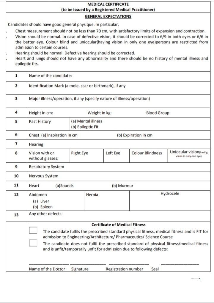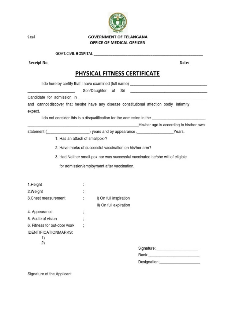 Certificate of medical fitness the certificate must be from the medical officer or any rank above it from any central/state government hospital/dispensary/medical college must be brought by the candidate at the time of interview. Signature of candidate i, dr.
